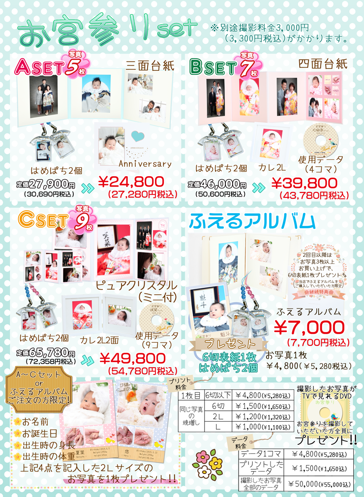 生後100日目を迎える赤ちゃんを祝う、「お食い初め」も撮影させていただいています。この頃になると表情も出てくるころですのでかわいい笑顔のお写真を残すことができます。お宮参りと合わせていかがでしょうか。